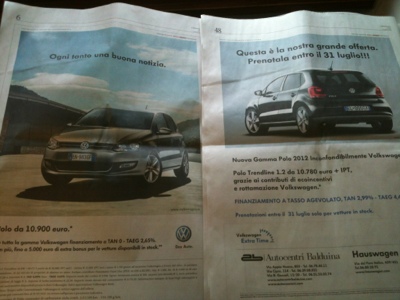 Oggi sul Messaggero doppia reclame della Polo. Quale sarà quella vera? Che è successo tra pag 6 e pag 48? Un aumento del mercato automobilistico?
