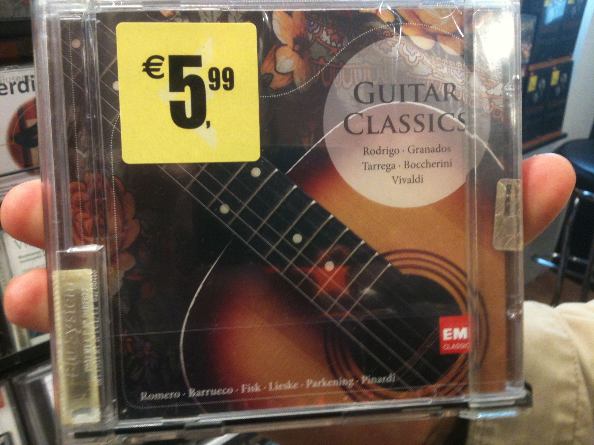 A parte la chitarra rovesciata, con la diagonale invertita rispetto alla posizione corretta, notiamo che si pubblicizzano i “classici” della chitarra come Rodrigo, Boccherini ecc. Con una chitarra acustica!!! Vi immaginate Romero, Barrueco o Fisk a fare finger picking sulla musica classica? E per fortuna che la “Emi Classics” è una delle major. Chissà perché sono in crisi…