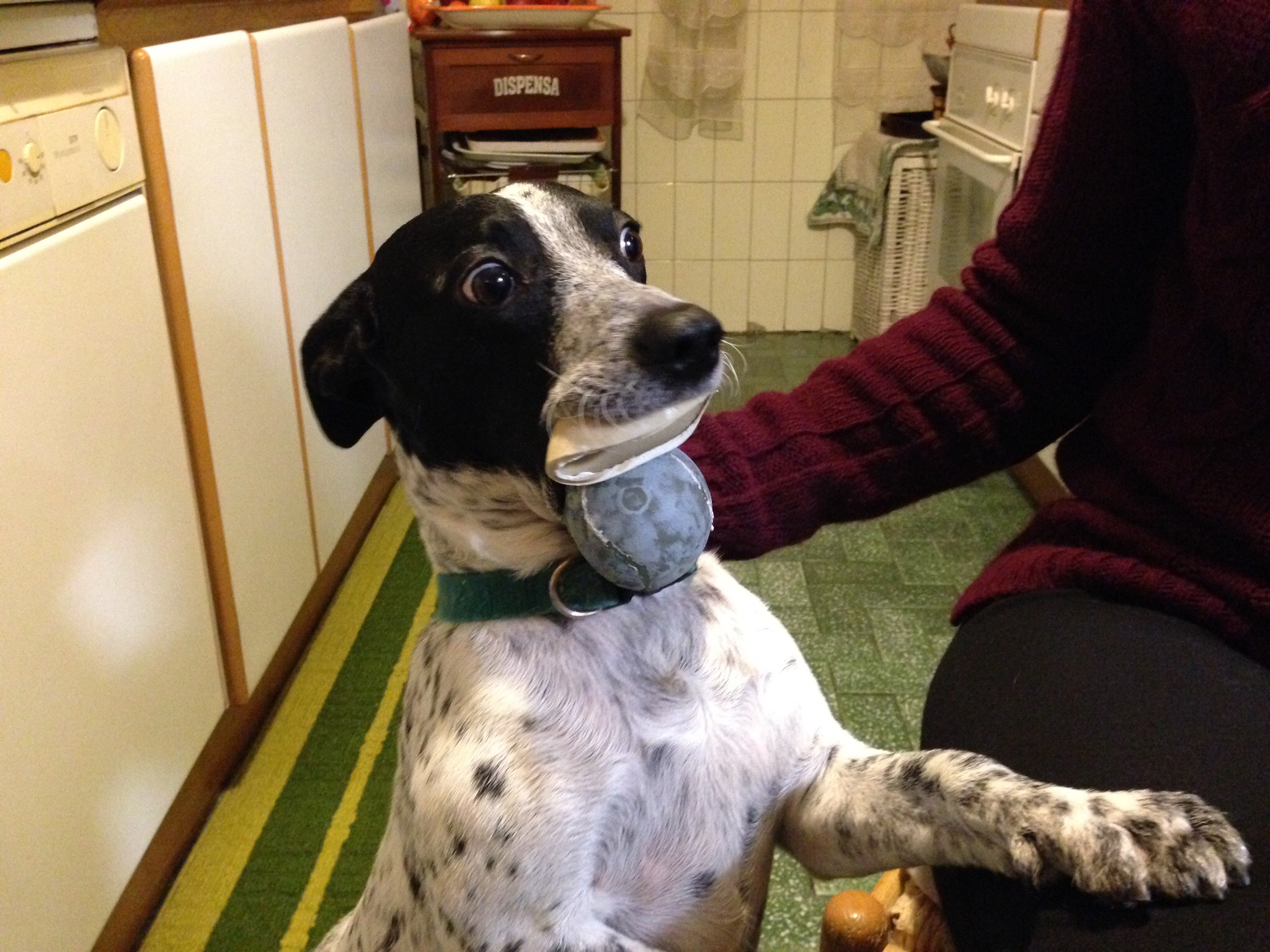 Pepe gioca sempre con due mezze pallette. Normalmente distrugge i suoi giocattoli -Pepe di nome e di fatto- ma le palline le ama. Questa foto rende l’idea di come sia abituato a tenere in bocca diversi oggetti in generale e le mezze pallette in particolare. Come si fa a non volergli bene?